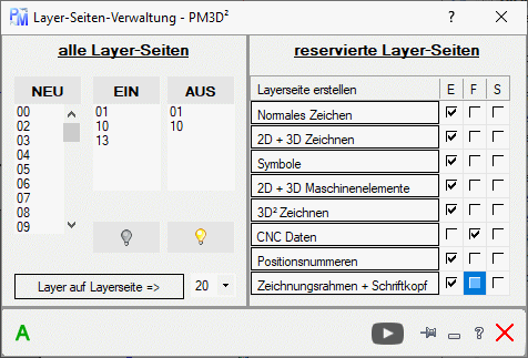 Mit der Layerseitenverwaltung können Sie die Layerseiten in Ihrer Zeichnung neu erstellen, ein oder ausschalten. Der Befehl enthält auch einige spezielle Funktionen zur Bearbeitung der Layerseiten. Eine Layerseite (00 bis 99) besteht aus 16 einzelne Layer.