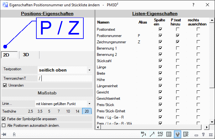 Mit diesem Befehl können Sie von den 2D-, 3D Positionsnummer, sowie Stückliste und Referenzliste die Eigenschaften einstellen. Ist der entsprechend Befehl fixiert und offen, wird er automatisch aktualisiert.