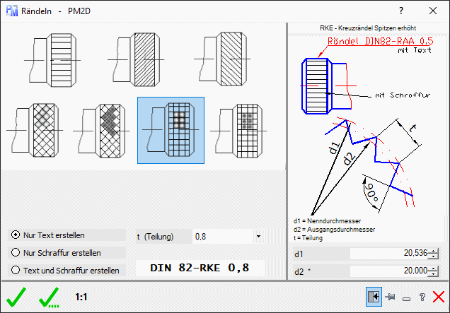 Der Befehl Rändeln erstellt verschiedene Rändelsymbole und -texte, ähnlich DIN 82.