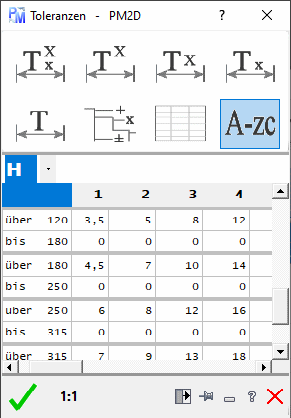 • Mit einem Doppelklick, auf die Toleranztabellenliste, wird eine große Toleranztabelle angezeigt.