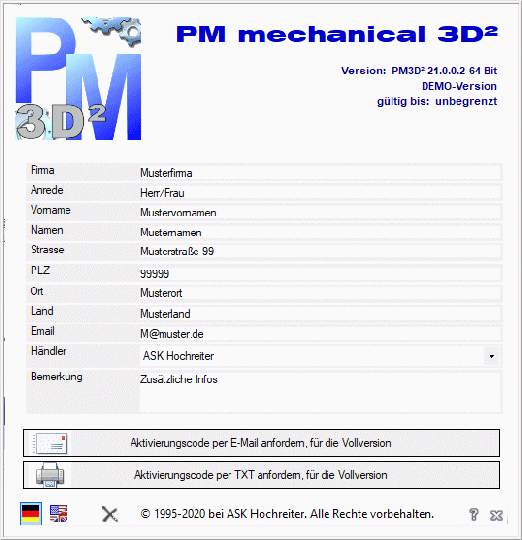 Testversions-Code-Anfordern     Aktivierungs-Code-Anforderung     Code-Eingabe