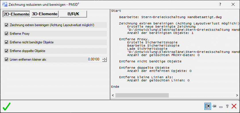 Sie können mit diesem Befehl, nicht benötigte Objekte wie Proxys, doppelte und übereinanderliegen 2D - Objekte, die für Zeichnung nicht sinnvoll sind, automatisch entfernen oder auch zu einem Objekt verbinden. Doppelte Objekte entstehen zum Beispiel, beim Kopieren von Objekten, beim Einfügen von Böcken.