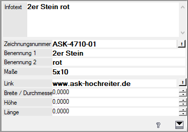 Hier können dem gewählten Block Informationen, ein Link, eine Teile-Nummer, -Maß, Breite, Höhe und eine Länge zuweisen. Es gibt vier Anzeigemöglichkeiten