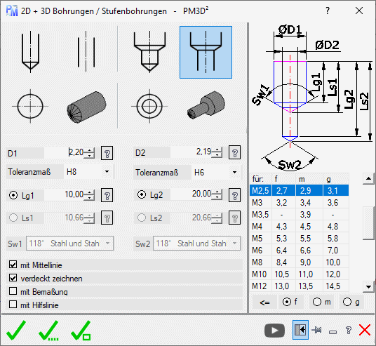 Fügt Bohrungen und Stufenbohrungen in verschiedenen 2D-Ansichten oder 3D-Festkörper, auch mehrfach, in die Zeichnung ein oder tauscht die Bohrungen aus. Ähnlich DIN EN 20373. Durchgangslöcher für Schrauben können aus einer Liste ähnlich DIN EN 20273 mit den Reihen f, m und g ausgewählt werden.