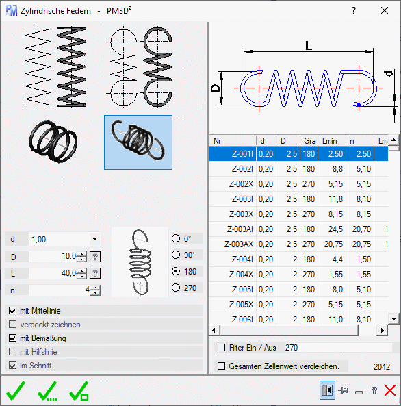 Zeichnet Druck- und Zugfedern in verschiedenen 2D-Ansichten oder erstellt einen  3D-Festkörper, ähnlich DIN 2162, DIN 2095, DIN 2096 und DIN 2097, EN 10270-1 und EN10270-2. Es sind 4100 vordefinierte Federn über die Liste wählbar. Diese können in der Länge anpassen.