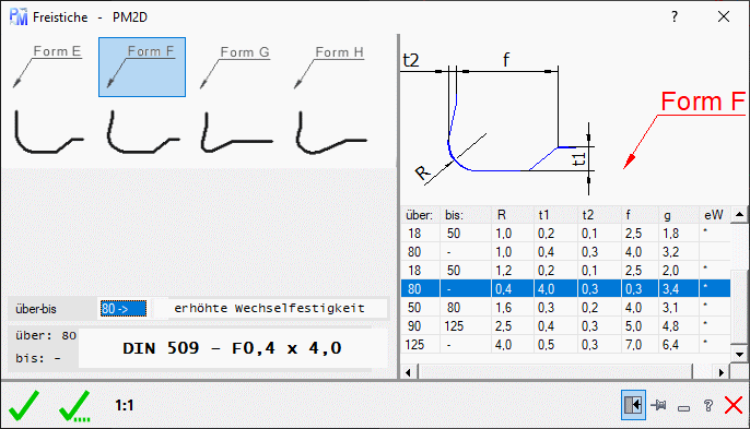 • über - bis: Liste zur Schnellauswahl der Freistichgrößen. Der Durchmesser muss größer sein als der erste Wert sein darf aber nicht größer als der zweite Wert sein. Die Beanspruchung, wird hinter der Liste abgegeben.