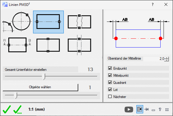 • Überstand der Mittellinie: Die Mittellinien werden um diesen Wert über die Volllinie gezeichnet. Dieser Wert kann auch in Einstellungen - Programm geändert werden.