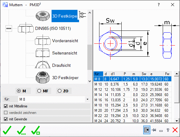 • Liste: Hier können die Maße der Muttern einsehen und die Mutter direkt in der Liste auswählen. Durch einen Doppelklick, wird der Befehl ausgeführt.
