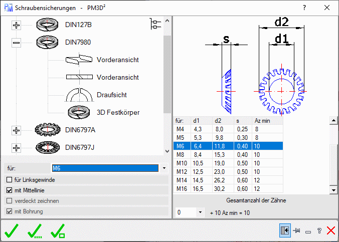 Erstellt verschiedene 2D- und 3D-Schraubensicherungen, ähnlich DIN127A, DIN127B, DIN7980, DIN6797A, DIN6797J und DIN6797V.