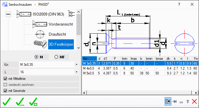 • Liste: Hier können die Maße der Schraube einsehen und die Schraube direkt in der Liste auswählen. Durch einen Doppelklick, wird der Befehl ausgeführt.