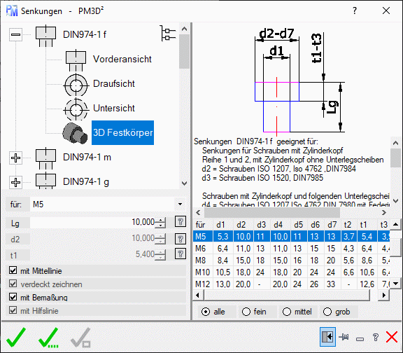 • fein: Es werden alle Senkungen in der Ausführung fein angezeigt  Die Maßtoleranzen sind klein