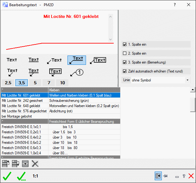 Die Liste enthält Bearbeitungstexte, für DIN 82 und DIN 509. Zum erstellen der Mehrfachführungsline, wird immer der aktuelle Mehrfachführungsstil benutzt und für den Text immer den Textstil “PM mechanical”.